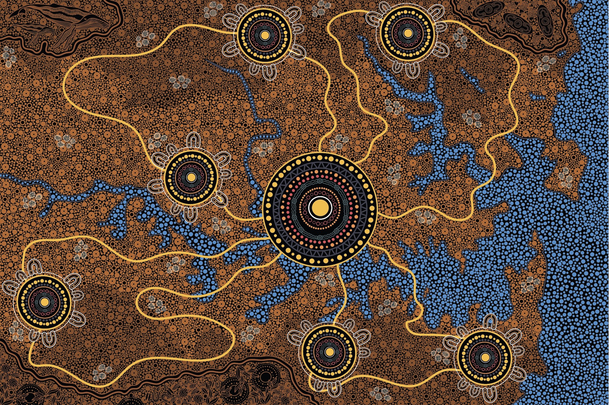 Light and brown dots represent the land. The top left side represents when the humpback whales would come into the harbour to birth their babies. Top right is the fisher women in their Nawi’s catching fish with their bara with a fire pit in the centre. The bottom left represents burning of the bush land of Tallawoladah, the rocky headland of Warrane (Sydney Cove) to keep the country open. It also represents cooking fires high on the slopes with meals of barbecued fish and shellfish. You can also see Walla-Mulla the young male kangaroo leaping through the bush during a hunt.