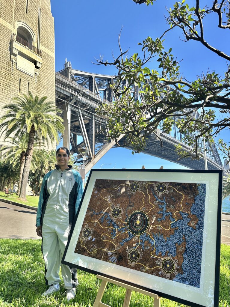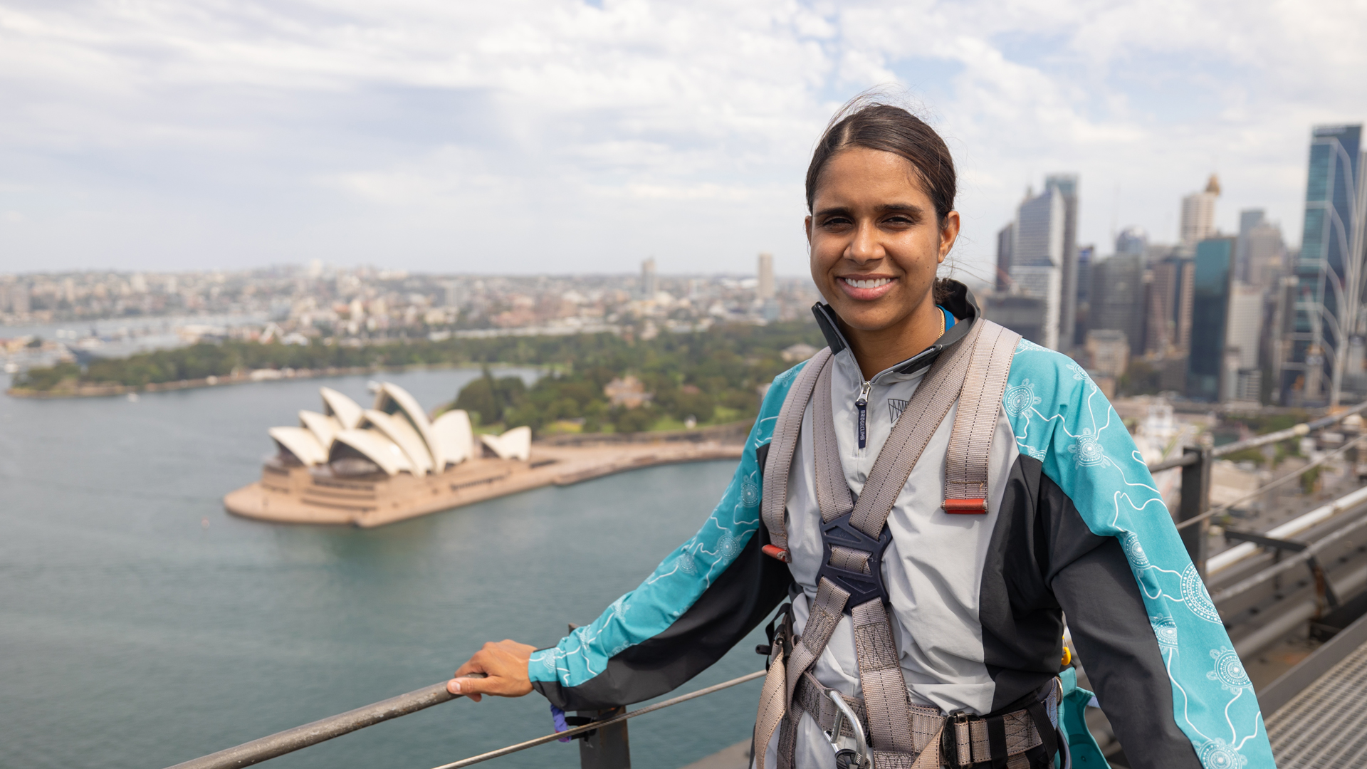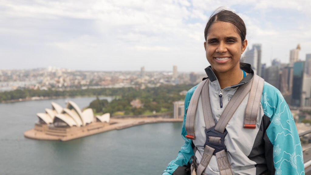 Taleena Simon was commissioned by BridgeClimb to create an artwork to be displayed at their Sydney headquarters and to feature on their new suits, which were launched in 2024.