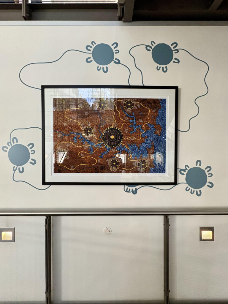 In the centre, the big gathering circle represents BridgeClimb. Inside you can see the pattern of the Harbour Bridge. On the outside are small gathering circles. These represent the groups who are participating in the Burrawa climb. The lines connecting the big gathering circle to the little ones represent the history of the Gadigal people and land being shared with the Burrawa groups. The traveling symbol within the gathering circles represent the people that have travelled from a far to visit the Harbour Bridge. The dots in the gathering circles represent everyone at BridgeClimb. Outside of the small gathering circles represents the Burrawa guides who guide travellers during the climb.